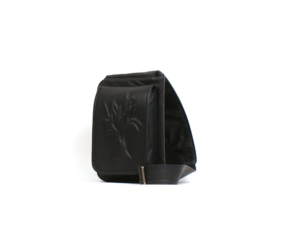 Black leather bag with adjustable shoulder strap up to 54 inches, multiple internal and external compartments. Ideal for travel.