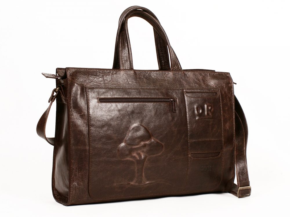 Brown unisex briefcase with a large back pocket and two interior pockets. Adjustable strap and handles.